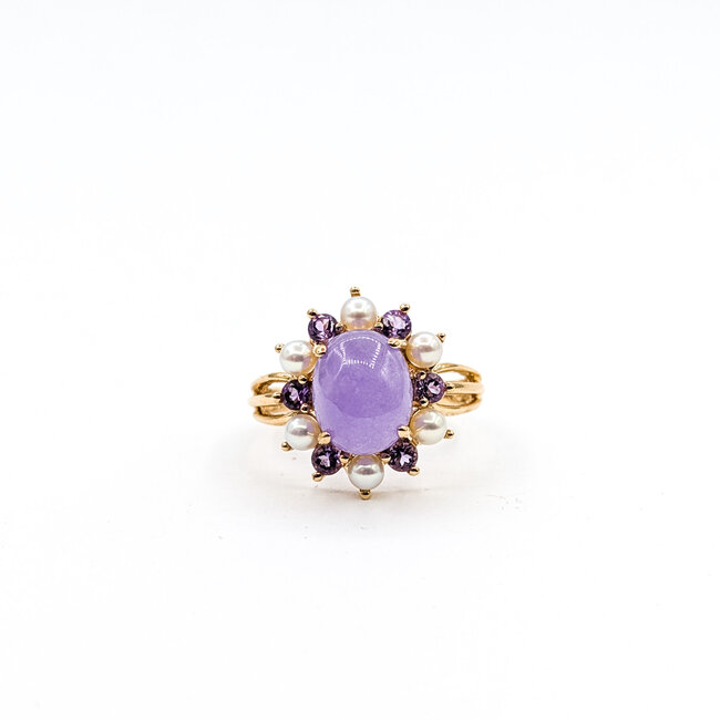 Ring 10mm x 8mm Lavendar Jade .18ctw Amethyst Pearls 14ky Sz7 4.2g 226012033