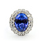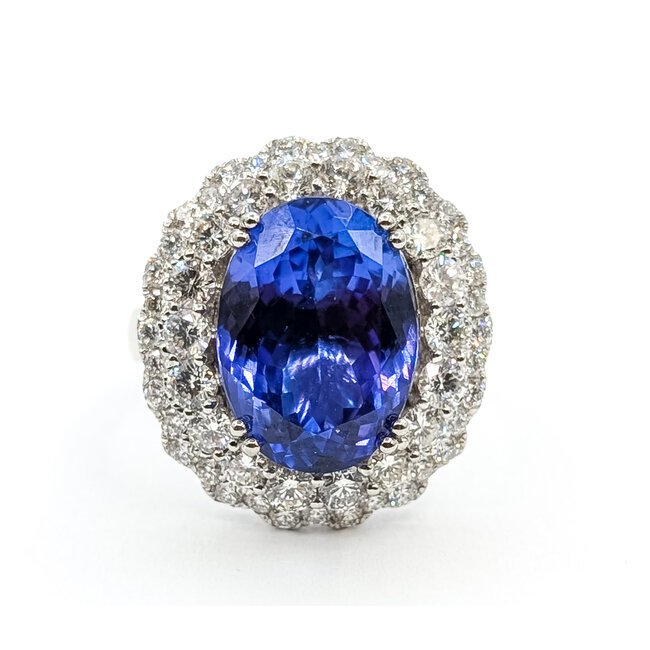 This ring is crafted in platinum and features prong-set bluish violet block "d" tanzanite, with a cocktail & double halo design. The tanzanite weighs 9.6ct. This ring is accented by round diamonds totaling 2.07ctw, near colorless color with SI clarity.