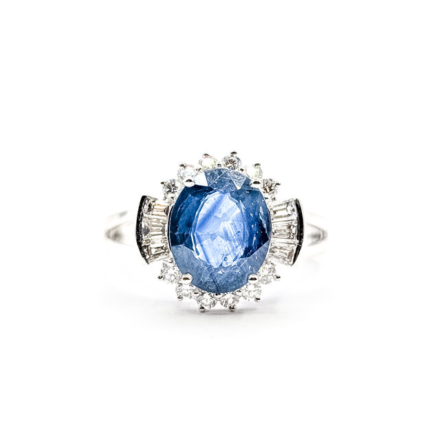 This ring is crafted in platinum and features prong-set blue sapphire, with a halo design. The sapphire weighs 3.6ct. This ring is accented by round & baguette diamonds totaling 0.56ctw, near colorless color with SI to I clarity.