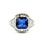 This ring is crafted in platinum and features prong-set blue ceylon sapphire, with a milgrain design. The ceylon sapphire weighs 4.54ct. This ring is accented by round & baguette diamonds totaling 1.34ctw, near colorless color with VS to SI clarity.